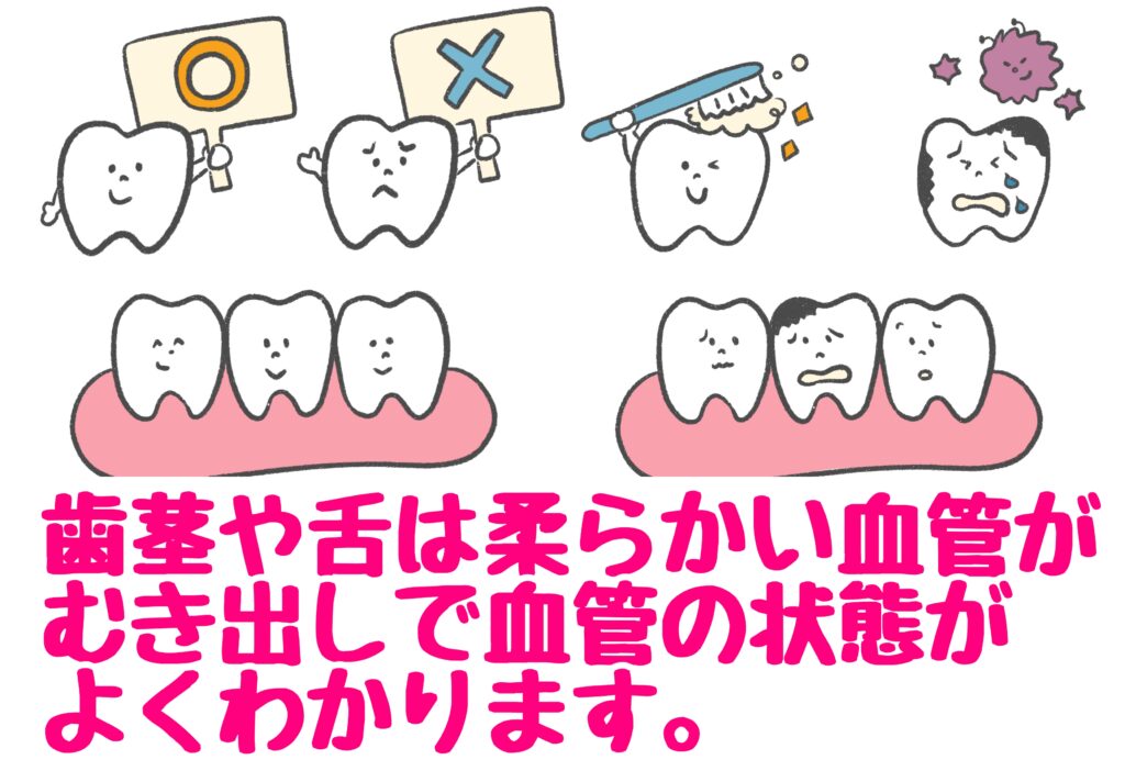 歯茎や舌は血管の状態がよくわかる 2025年7月31日 最終更新日時 : 2025年7月31日 admin_cattlebody 歯茎や舌は柔らかい血管がむき出しで血管の状態がよくわかります。健康な人の歯茎はピンク色をしていますが、歯茎の血流が悪くなると歯茎にしっかりと栄養や酸素が届かず、歯周病になるリスクが高まります。また、舌は毛細血管が多く集まる粘膜組織です。血流が悪くなると変化が現れやすくなります。舌が真っ赤だと水分が不足していたり、黄色いと胃腸の疲れが溜まっているといわれています。日頃から歯茎や歯の状態をチェックして自身の健康状態と向き合い、足つぼマッサージで全身の血流を良くしていきましょう☺️